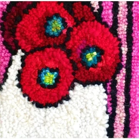 Canadian artist Donna Mulholland is contemporary rug hooker, working in an expressive and freeform style. The pieces in this series are hooked primarily in wool yarn, jersey and sari silk.