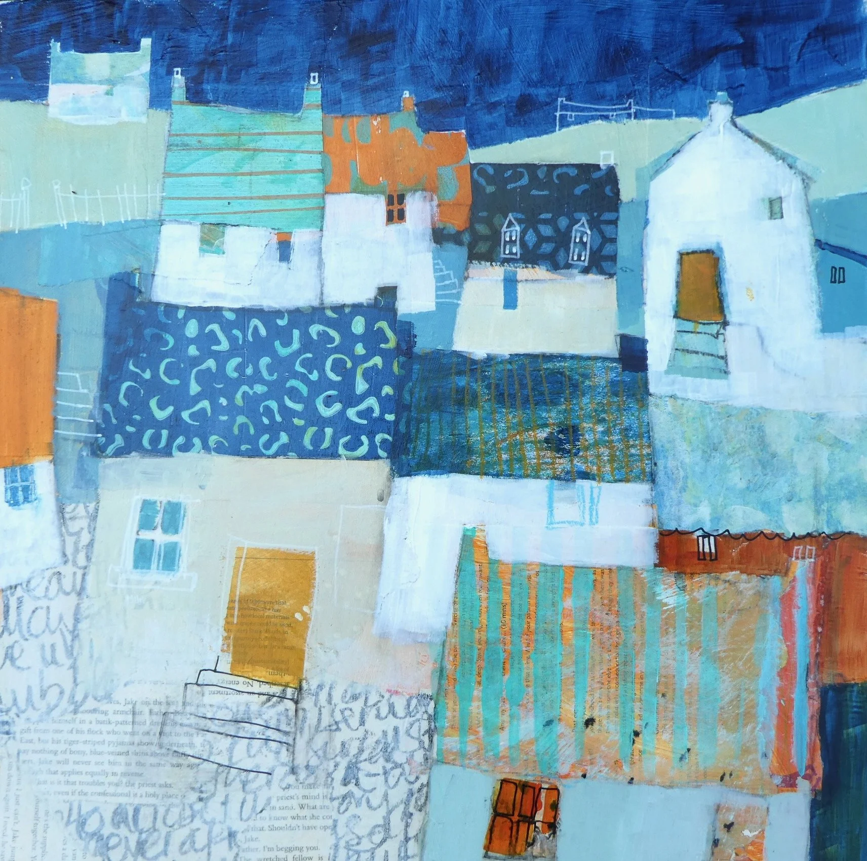 More recently she has turned to painting pure abstracts. These arrive from a sense of play initially followed by a more thoughtful editing to find the hidden treasures. Using knowledge of composition and design to get to the balance at the end. There are many layers providing a history in the making.