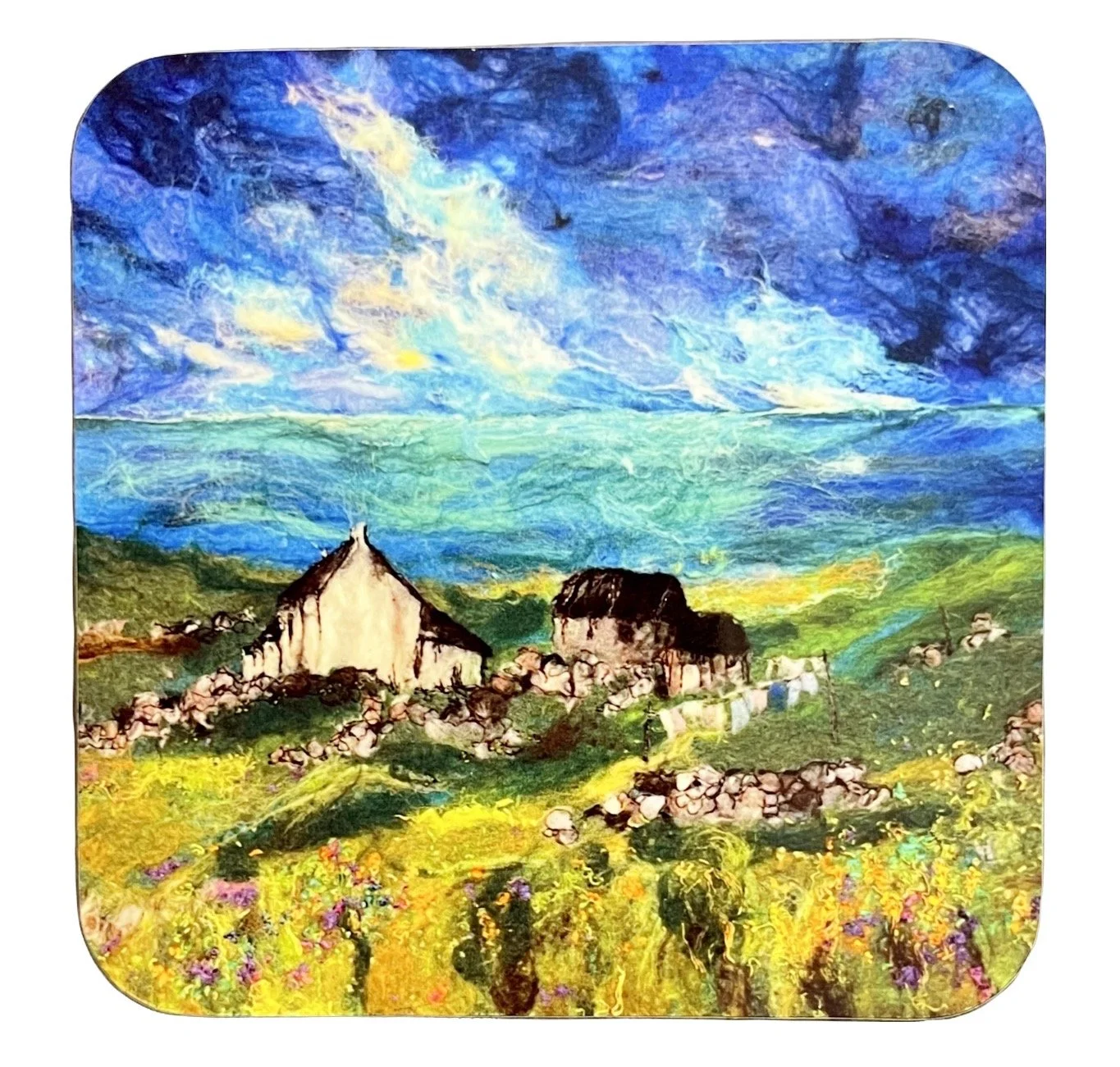 A glossy hardboard coaster depicts one of Moy’s most popular artworks.